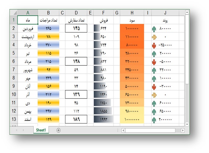 کاندیشنال فرمتینگ(Conditional Formatting) یا فرمتهای شرطی که به آن قالببندی شرطی نیز میگویند برای ایجاد ظاهری متفاوت در سلولها است تا بتوانیم تغییرات موجود در سلولها را از ظاهر آنها تشخیص دهیم. به عنوان مثال برای تعیین بیشترین تعداد تولید در مهرماه میتوانیم با استفاده از Conditional Formatting رنگ سلولی را که بیشترین مقدار را داشته باشد تغییر دهیم.