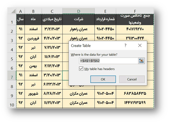 در حالت عادی ما اطلاعات خودمون رو در سلول های موجود در هر شیت وارد میکنیم. زمانی که ما حجم اطلاعات زیادی داریم که به شکل یک جدول هستند، یعنی سرستون های مشخصی دارند و در سطرهای بعدی اطلاعات ثبت میشن شاید بهتر باشه که محدوده سلول های خودمون رو به یک Table تبدیل کنیم.